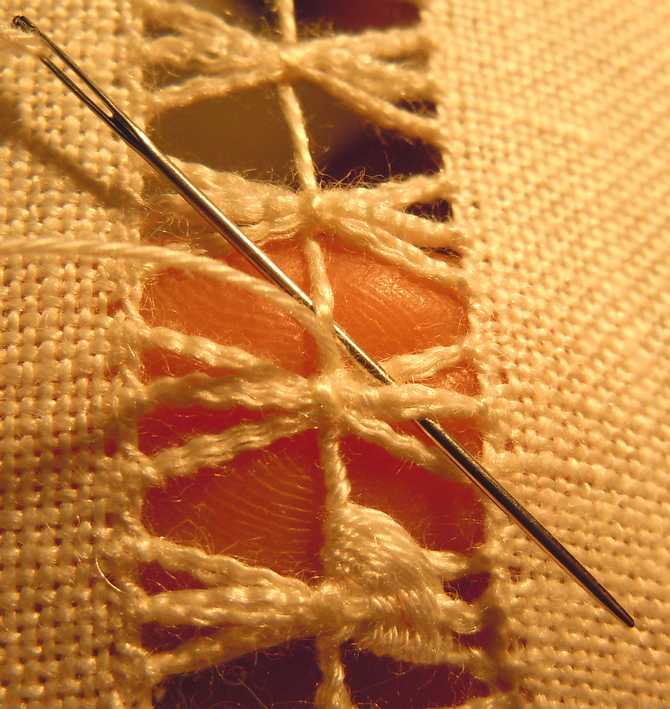 Preparare una sfilatura di 20 fili tolti e formare le barrette con l'orlo a giorno di 4 fili.