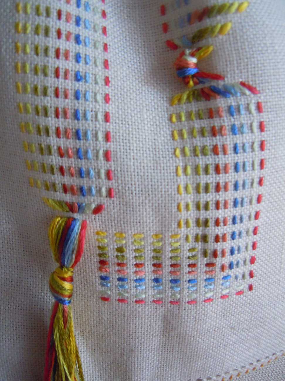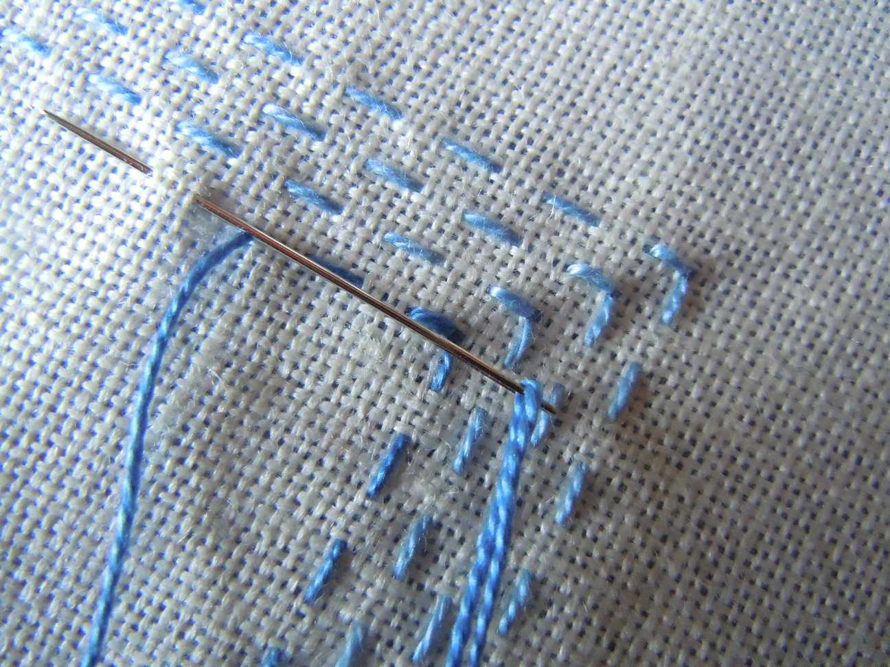 Sospendiamo le sfilature e prendiamo in considerazione i fondini o retini , sono piccoli punti di fondo possono servire a riempire dei petali o degli spazi oppure si possono usare anche come ricami , iniziamo dalla forma più semplice in assoluto una filza, in questo caso lavorata su quattro fili, come primo lavoro un piccolo cuscinetto con due tonalità di azzurro e un giallo.