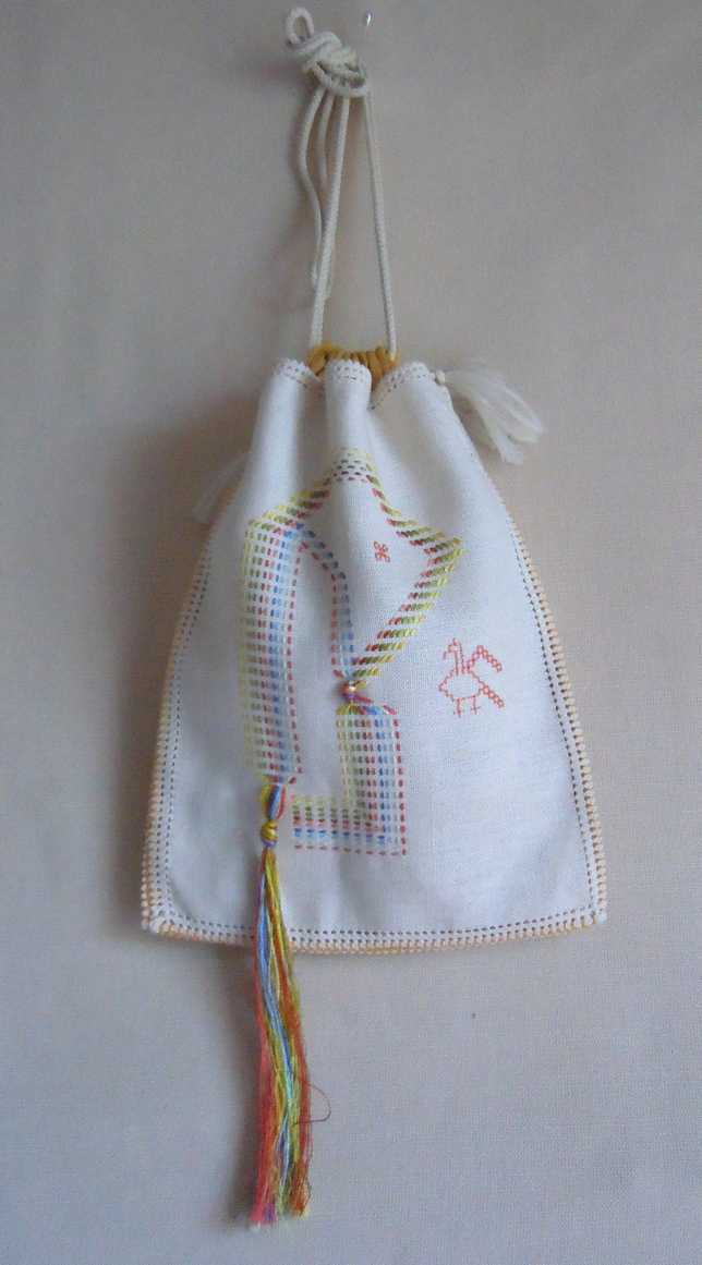 Un'altro esempio di come usare una filza - una elegante borsettina, lavorata con fili di mulinè in seta di vari colori in file parallele.